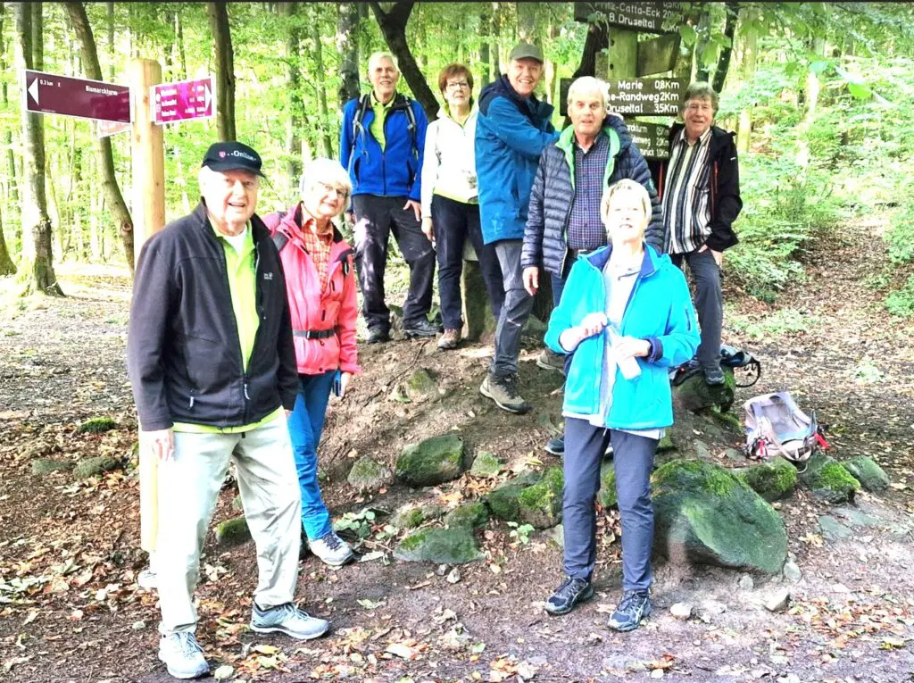 Nach zweieinhalb Kilometern erreichten wir die „Kaffeemühle“, eine allseits bekannte Wegmarke und marschierten weiter durch herrlichen Buchenwald in Richtung Bismarckturm. Kurz davor, auf dem sogenannten Brasselsbergsattel, gönnten wir uns eine Trinkpause. Ein freundlicher Biker, wohl beeindruckt von so viel Wanderdisziplin, hielt den Moment mit einem Gruppenfoto fest.